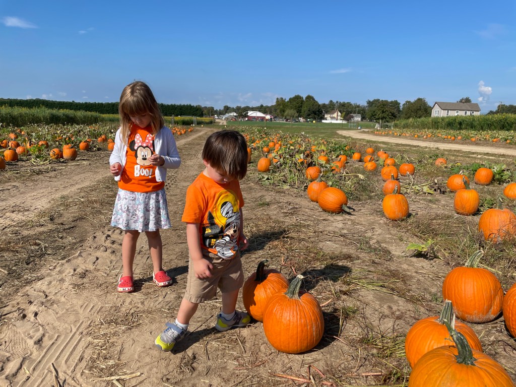 Let’s just say, the memorable part began in the parking lot when we pulled in. As I was assessing everything we needed, my son suddenly jumped out of the stroller and took off across the parking lot. Terrified, I ran “mama fast”, which is of course faster than I could possibly run at any other time. I scooped him up and brought his squirming little self back to the stroller. In the next parking spot over, another family had witnessed the incident. They were looking their Fall Harvest best, primping for a fall photo shoot in their matching flannel outfits and high heels. I smiled sheepishly at them. They rolled their eyes and snickered at me. Apparently Fall harvest glam folks have never had such a thing happen to them. We walked past them quickly, sporting our own version of pumpkin patch wear: orange Disney Halloween t-shirts, shorts (my daughter had “matched” her orange t-shirt with a pink unicorn patterned skirt); and sneakers (I was sporting my bright red Minnie Mouse sneakers). We looked properly ridiculous for Friday Funday.