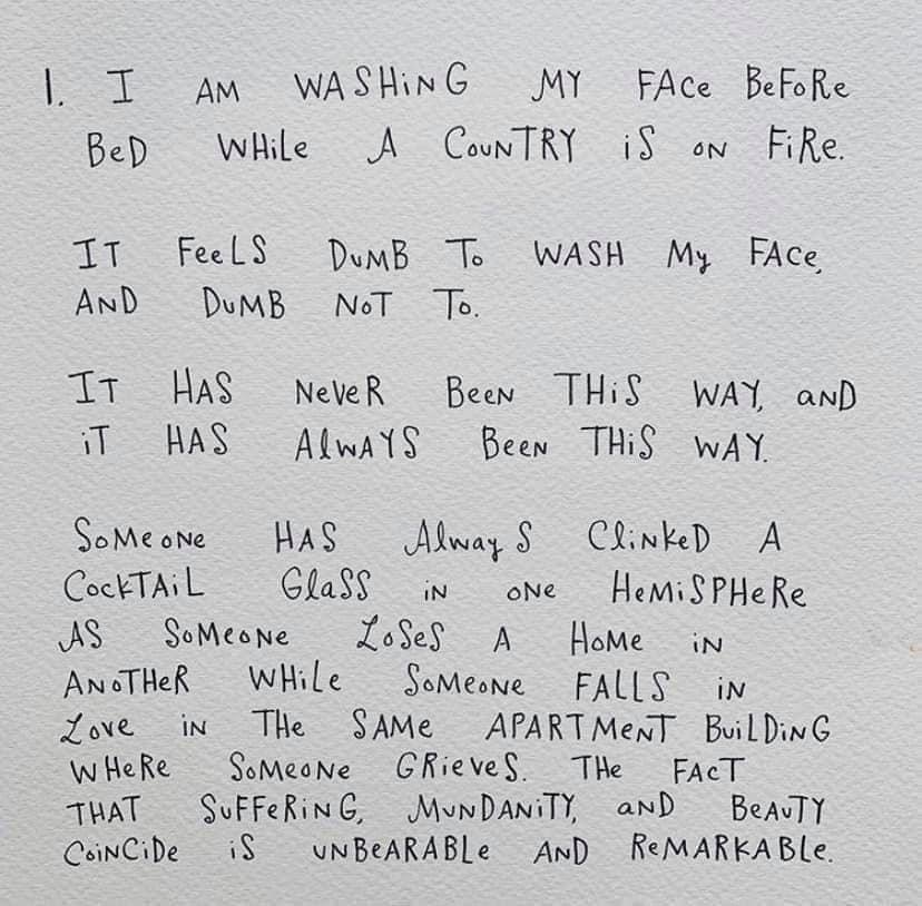 It’s hard living half a world away from an unjust war and watching it happen on TV. We can feel so helpless as we watch it play out, but have no resources to change anything from all the way over here. I saw a poem by Mari Andrew the other day posted on social media, which captures how many of us are feeling right now: