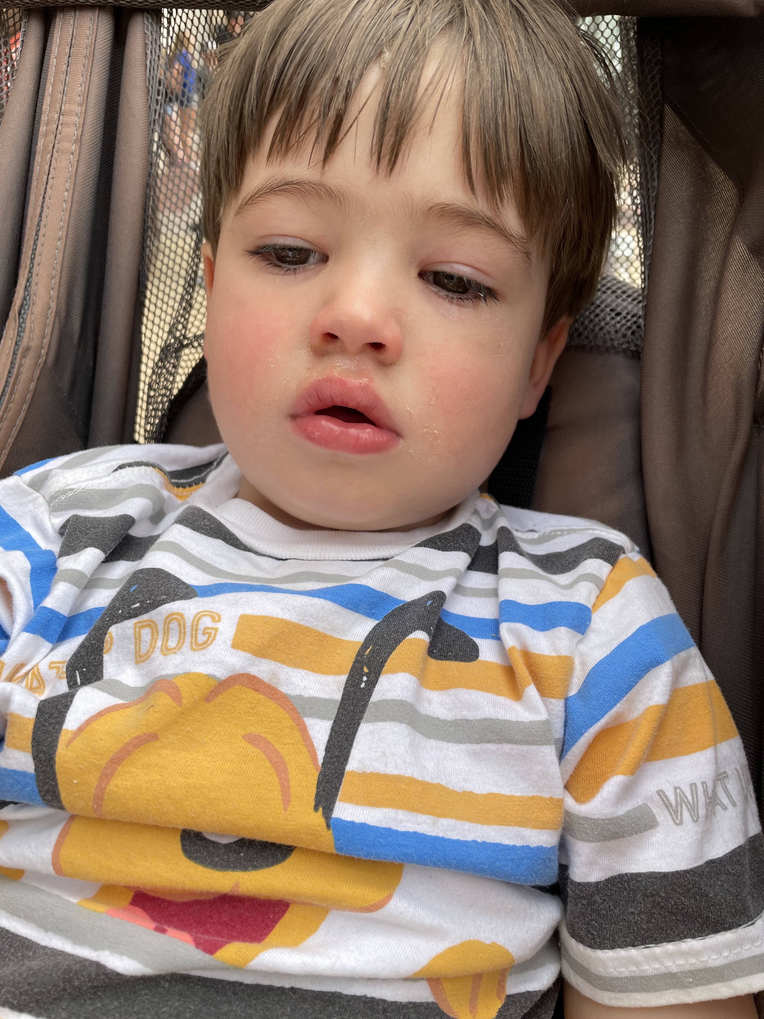 Yet after pool and lunch, our son was feeling fine. So, we took the bus to Disney Springs to shop. It was here that he awoke from a stroller nap, red eyed, snotty, and spiking a fever (1st picture below). We headed back to the hotel, where he rallied on the bus. as his new Donald stuffy made everything better (2nd picture below, 20 minutes later). After a bath, the fever spiked again and fell asleep.